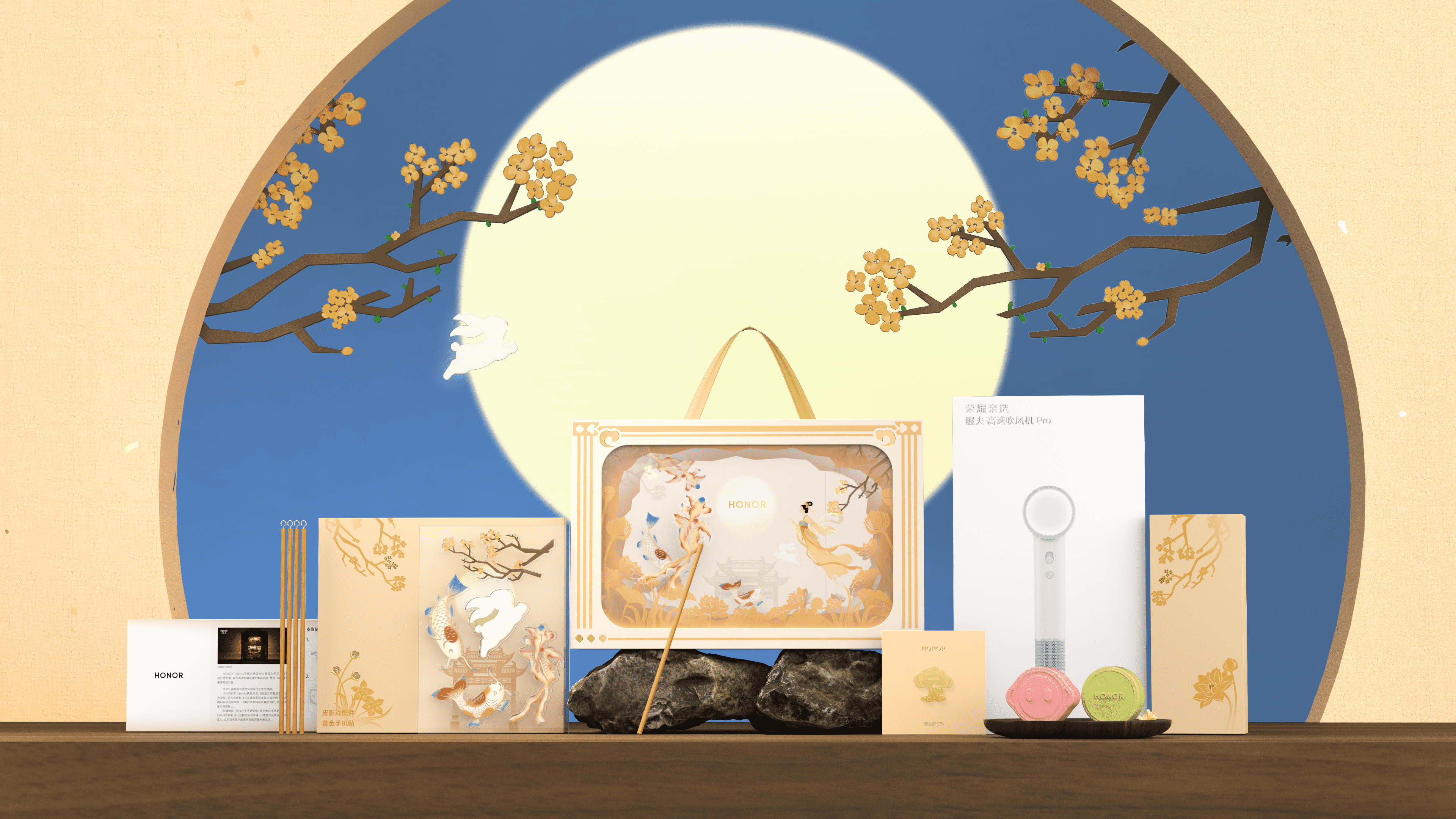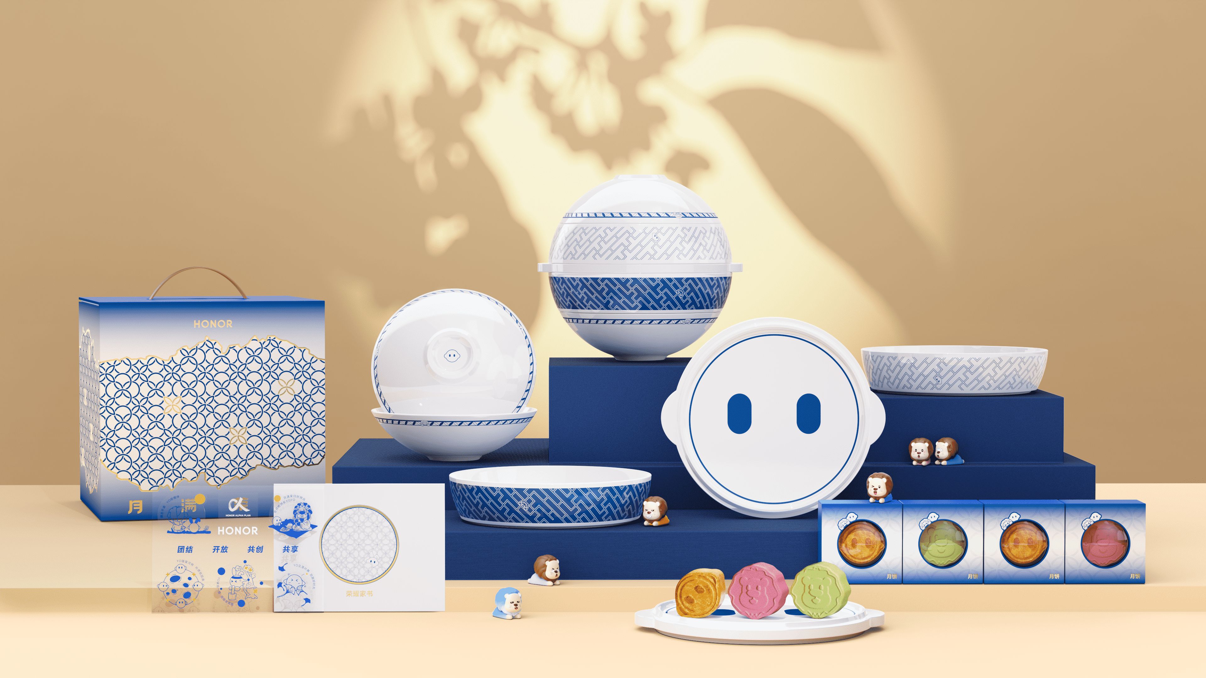 荣耀的员工版中秋礼盒,以“月满荣归”为主题,将青花瓷技艺、东方吉祥纹样与荣耀科技美学凝练于一器。