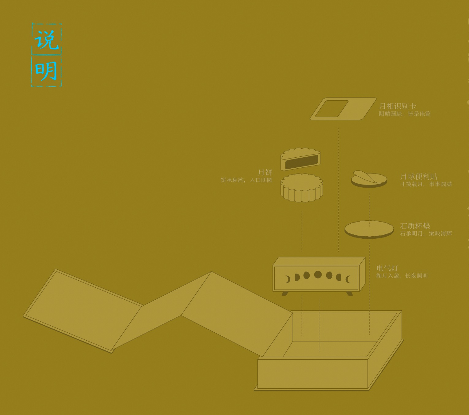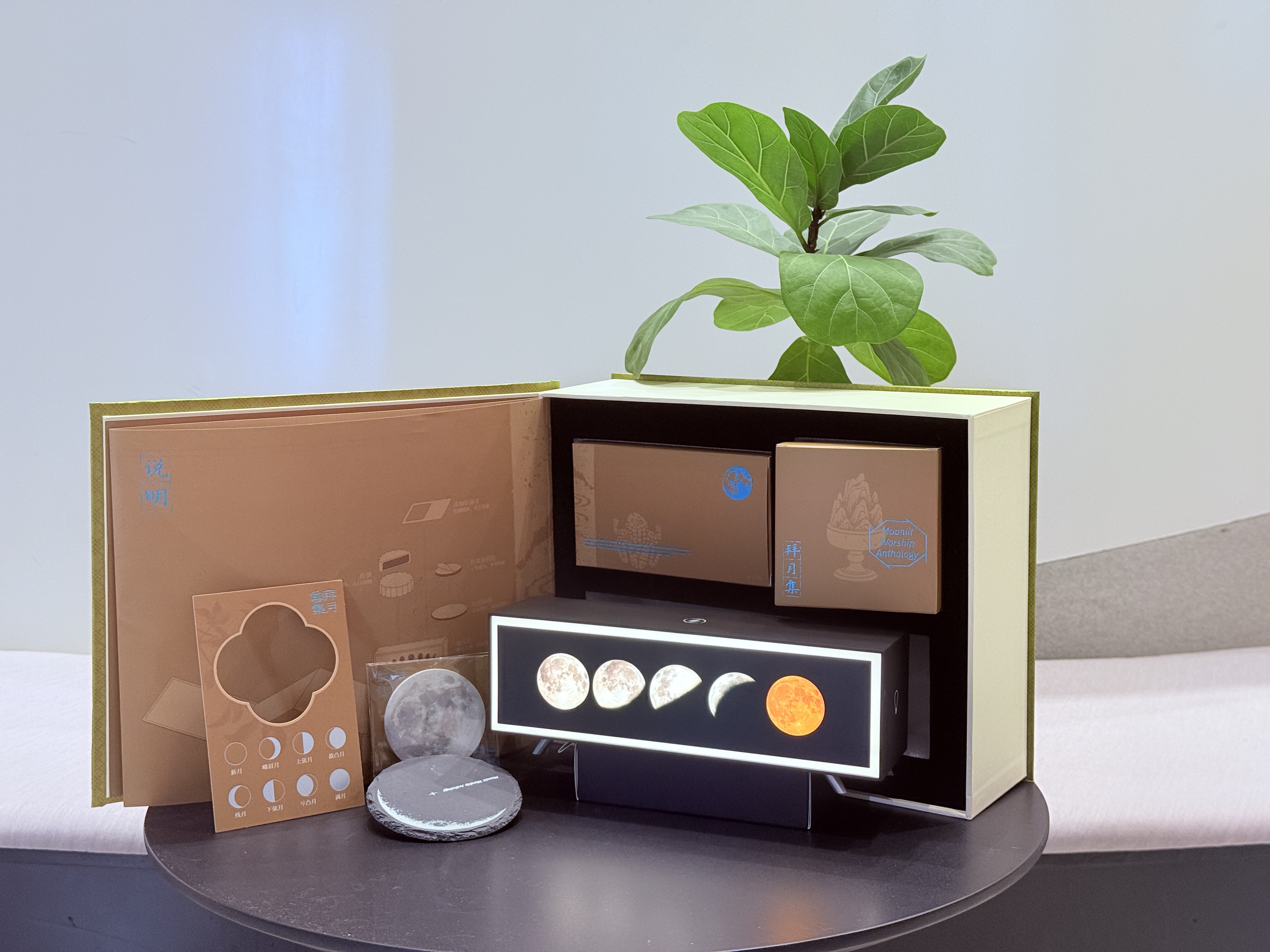 这盒子里装的每一件,都是和月亮“串通”好的小巧思——月饼,饼承秋韵,寓意入口团圆;月相识别卡,帮助你观察阴睛圆缺;月球便利贴,寸笺载月,寓意事事圆满;石质杯垫,石承明月,案映清辉;电气灯,掬月入盏,为长夜照明。