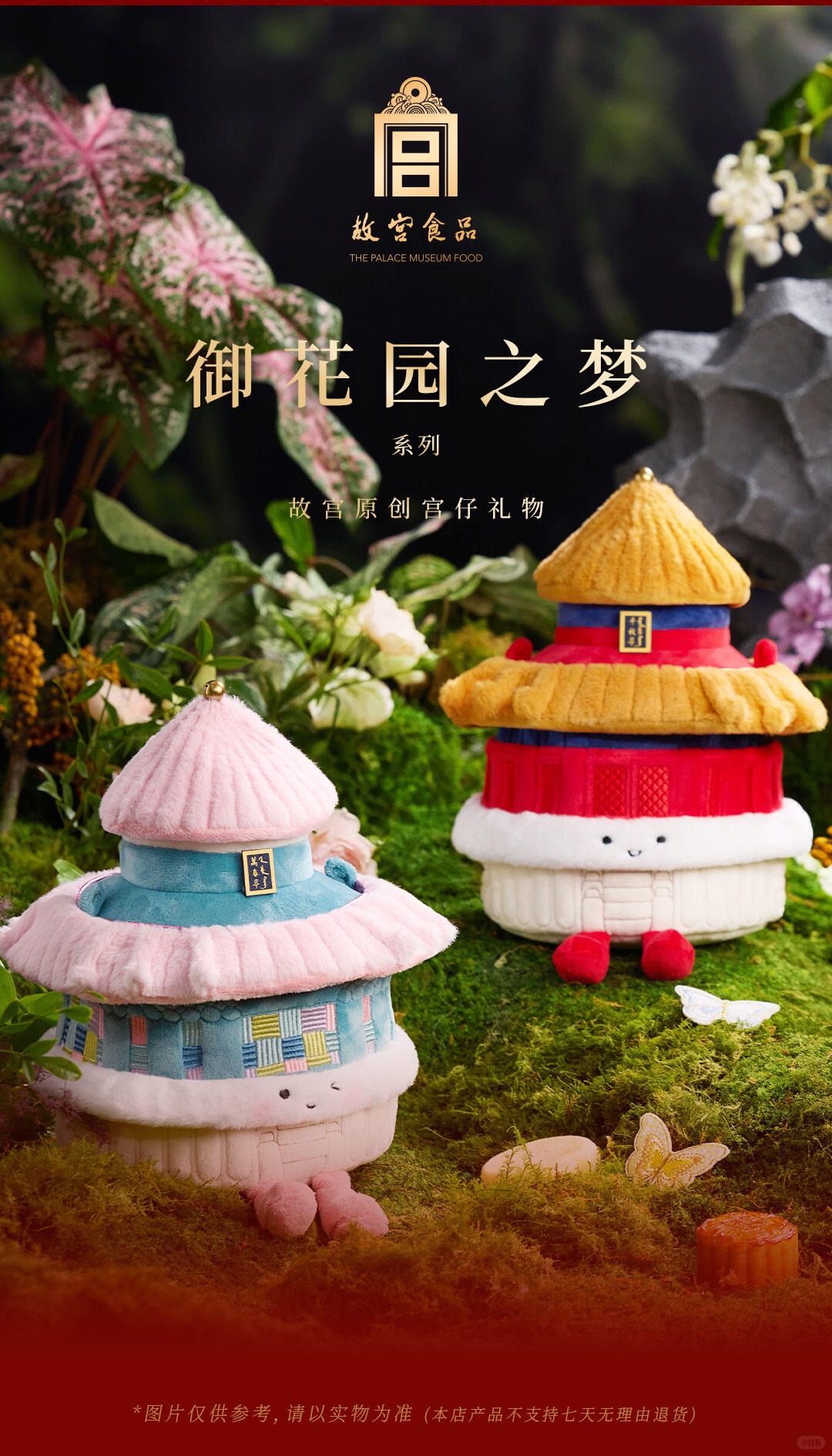 故宫食品特别推出御花园之梦系列中秋礼盒。两款礼盒是两种配色的故宫“宫”仔,分别以万春亭、千秋亭为原型。两座亭子分别位于御花园内浮碧亭、澄瑞亭以南,是一对造型、构造均相同的建筑,只有藻井(室内上方)彩画有细微的差别。