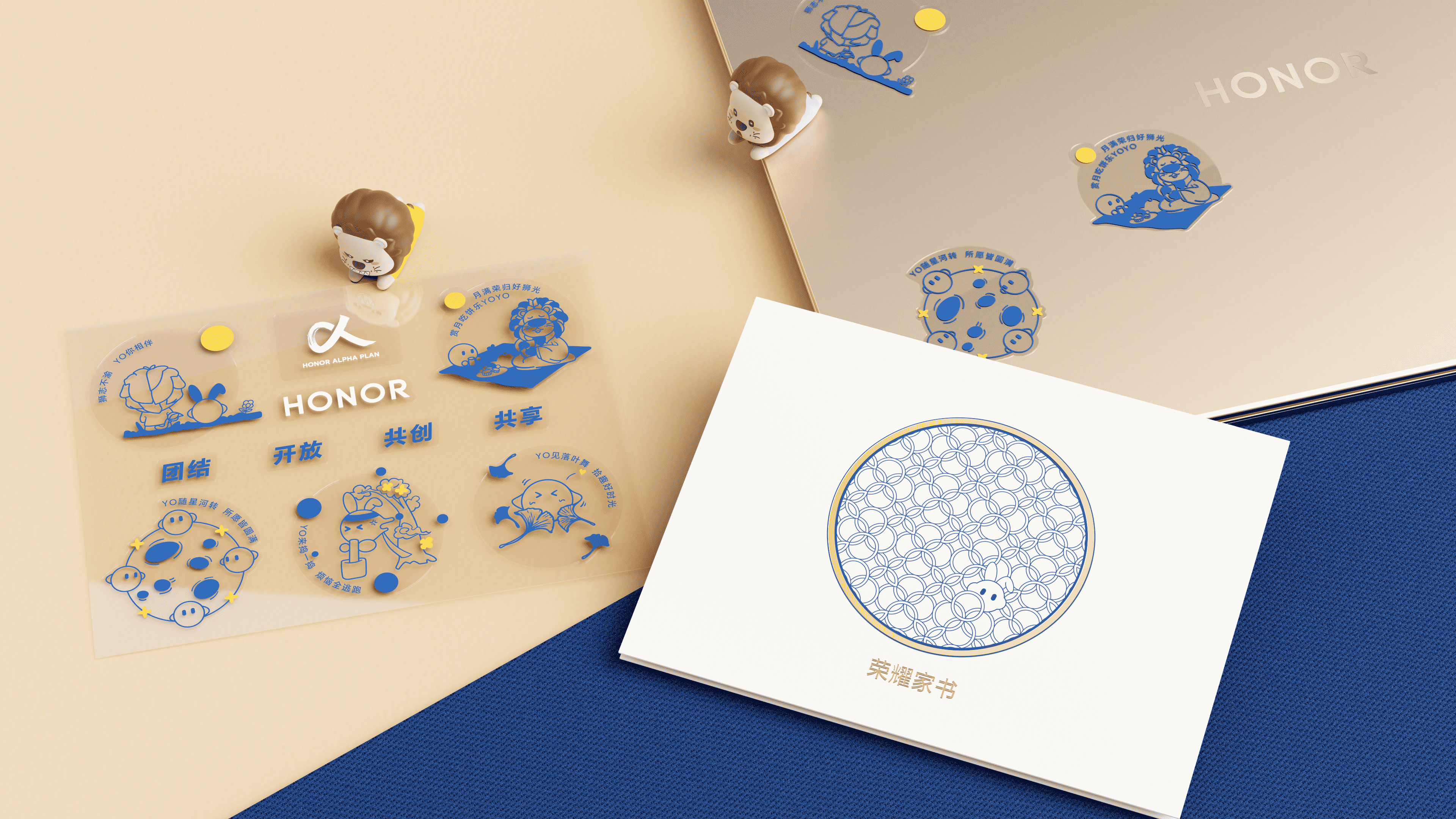 礼盒内含荣耀家书、瓷器碗盘、月饼、趣味贴纸和荣耀小狮子萌粒。