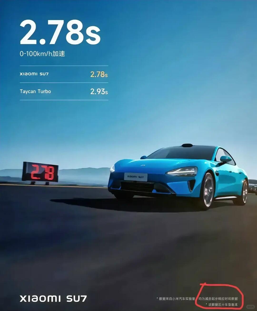 去年的海报中,百公里加速的数字,小字备注是“减去起步响应时间的数据”。