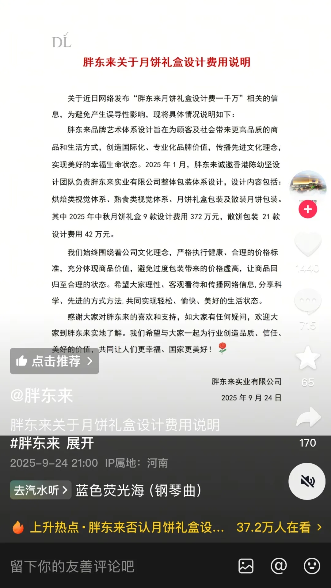 对于“一千万设计费”的说法,9月24日,胖东来官方抖音发布说明回应。其中显示,陈幼坚设计团队负责胖东来实业有限公司整体包装体系设计,设计内容包括:烘焙类、熟食类视觉体系,月饼礼盒包装及散装月饼包装。
