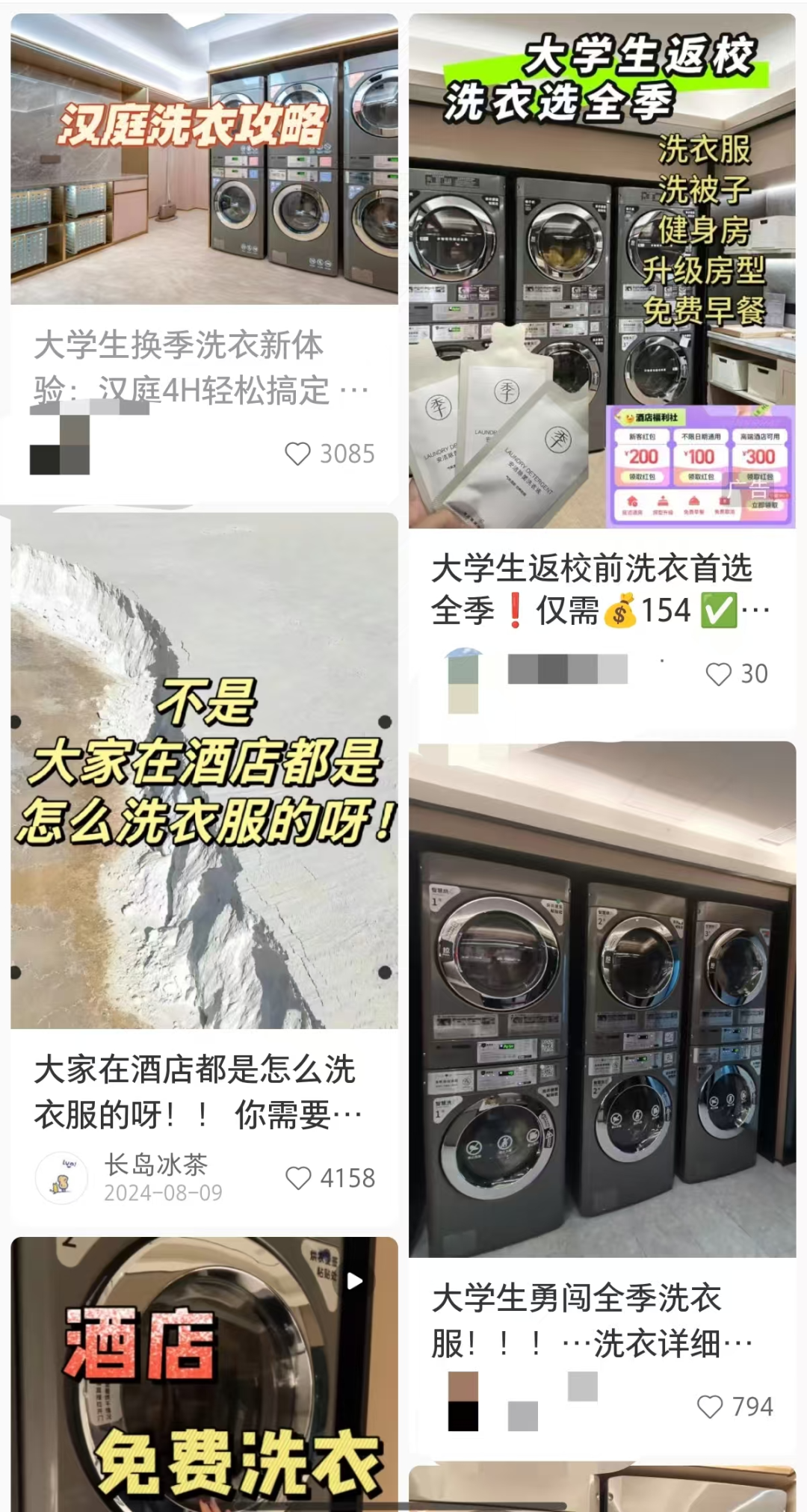 这股风是从 2024 年下半年开始的。不少合租青年、大学生会用钟点房在酒店洗衣。例如,在武汉,一名网友用约130 元开了4小时房间,用酒店商用洗烘设备洗烘多件衣物,比送洗便宜又高效。