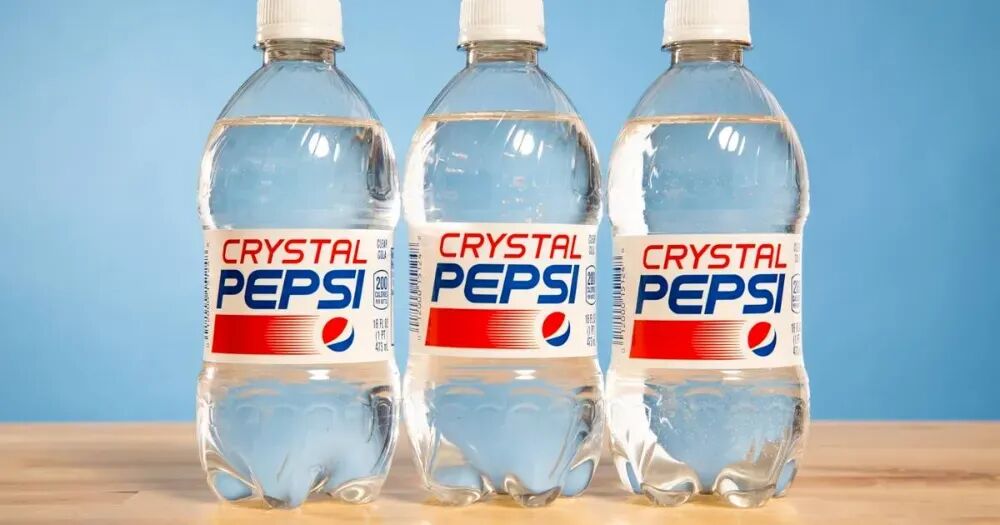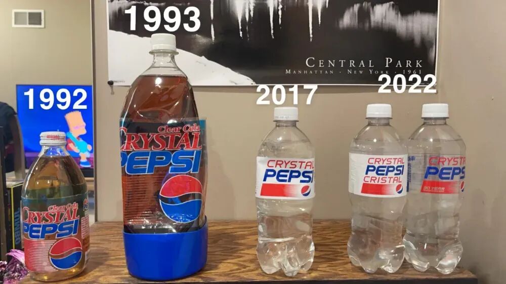但那终究是小规模定制产品,透明可乐正式推出还得是1992年的Crystal Pepsi(下文均称水晶可乐)。90年代,消费者开始追求更健康的食物,百事为此研发了水晶可乐——去掉经典可乐配方中焦糖,用高果糖玉米糖浆替代,最终呈现的可乐呈透明状,不仅热量更低,甜味略低于经典可乐。[3]