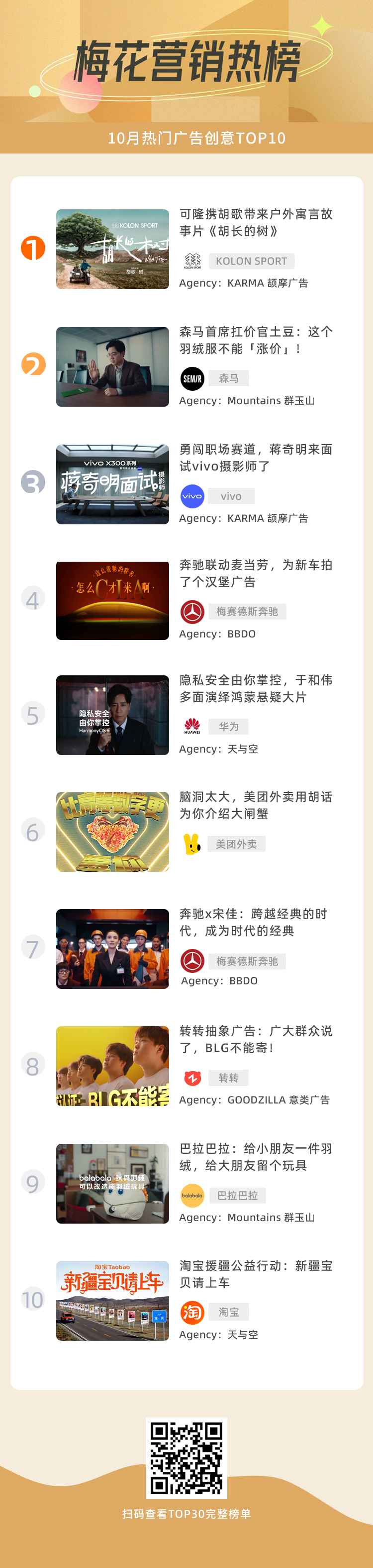 梅花营销热榜 是梅花网基于平台收录作品的点击数、喜欢数、收藏数等数据综合得出的创意榜单,10月榜单新鲜出炉!