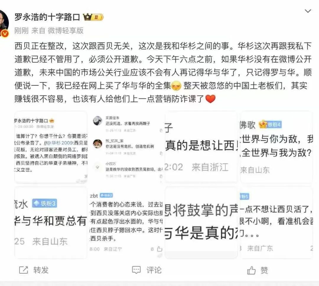 西贝正在整改,这次跟西贝无关,这次是我和华杉之间的事。华杉这次再跟我私下道歉已经不管用了,必须公开道歉。今天下午六点之前,如果华杉没有在微博公开道歉,未来中国的市场公关行业应该不会有人再记得华与华了,只记得罗与华。顺便说一下,我已经在网上买了华与华的全集 整天被忽悠的中国土老板们,其实赚钱很不容易,也该有人给他们上一点营销防诈课了