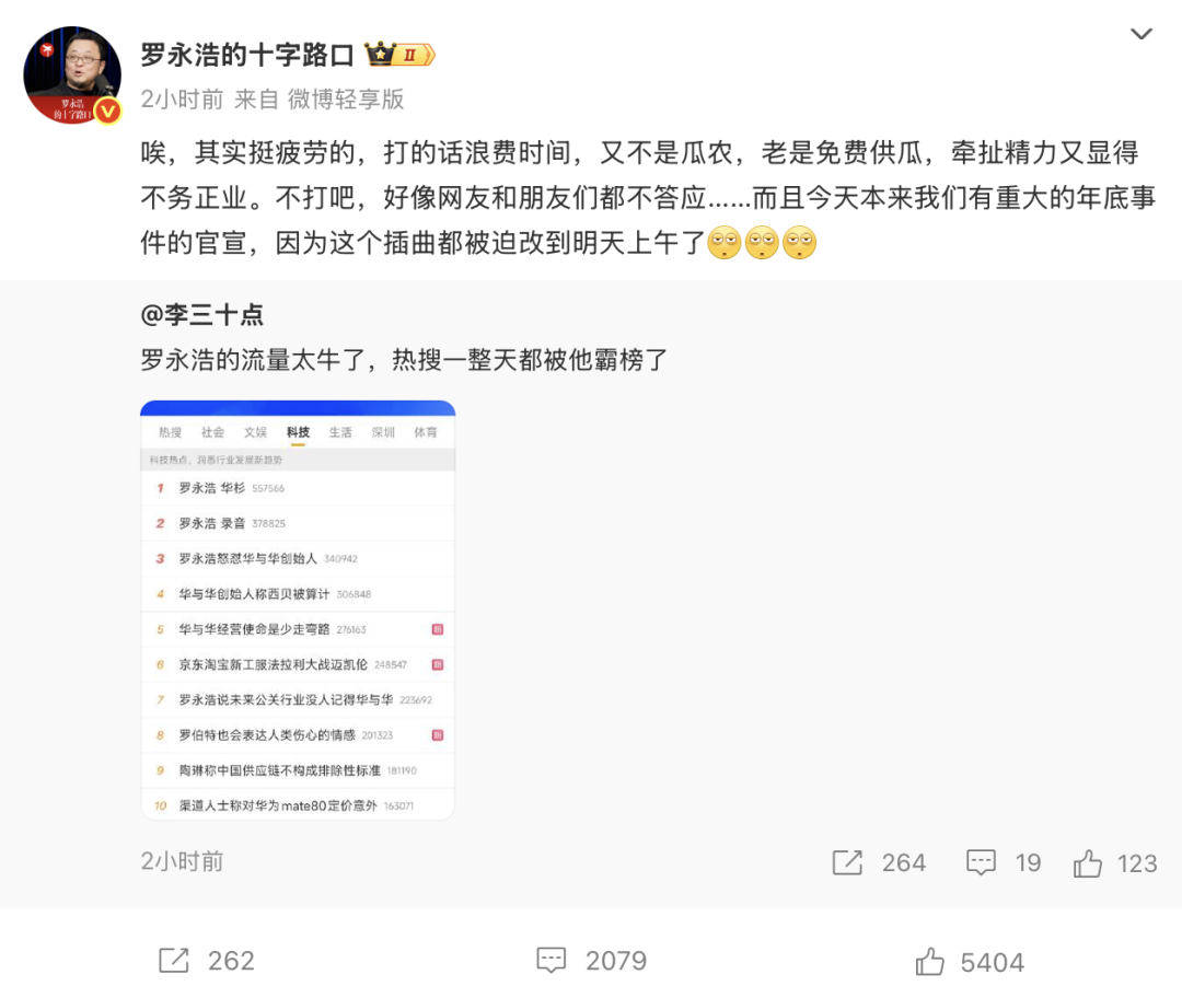 短短1个小时,罗永浩登上至少5个微博热搜!