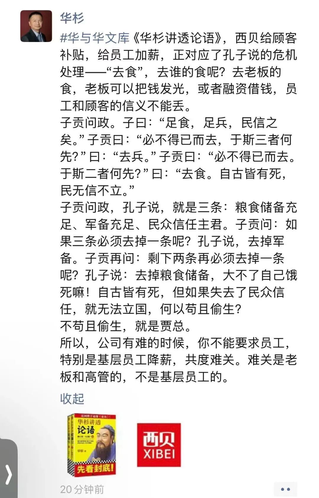 这次的情况,其实类似。如果你仔细看他的微博文案,华总的重点其实是“西贝是中国餐饮业的天花板,无论对顾客还是对员工,都是诚心诚意做到极致……西贝坚持自己的华夏子弟精神,不苟且偷生,凭仁义立世。”
