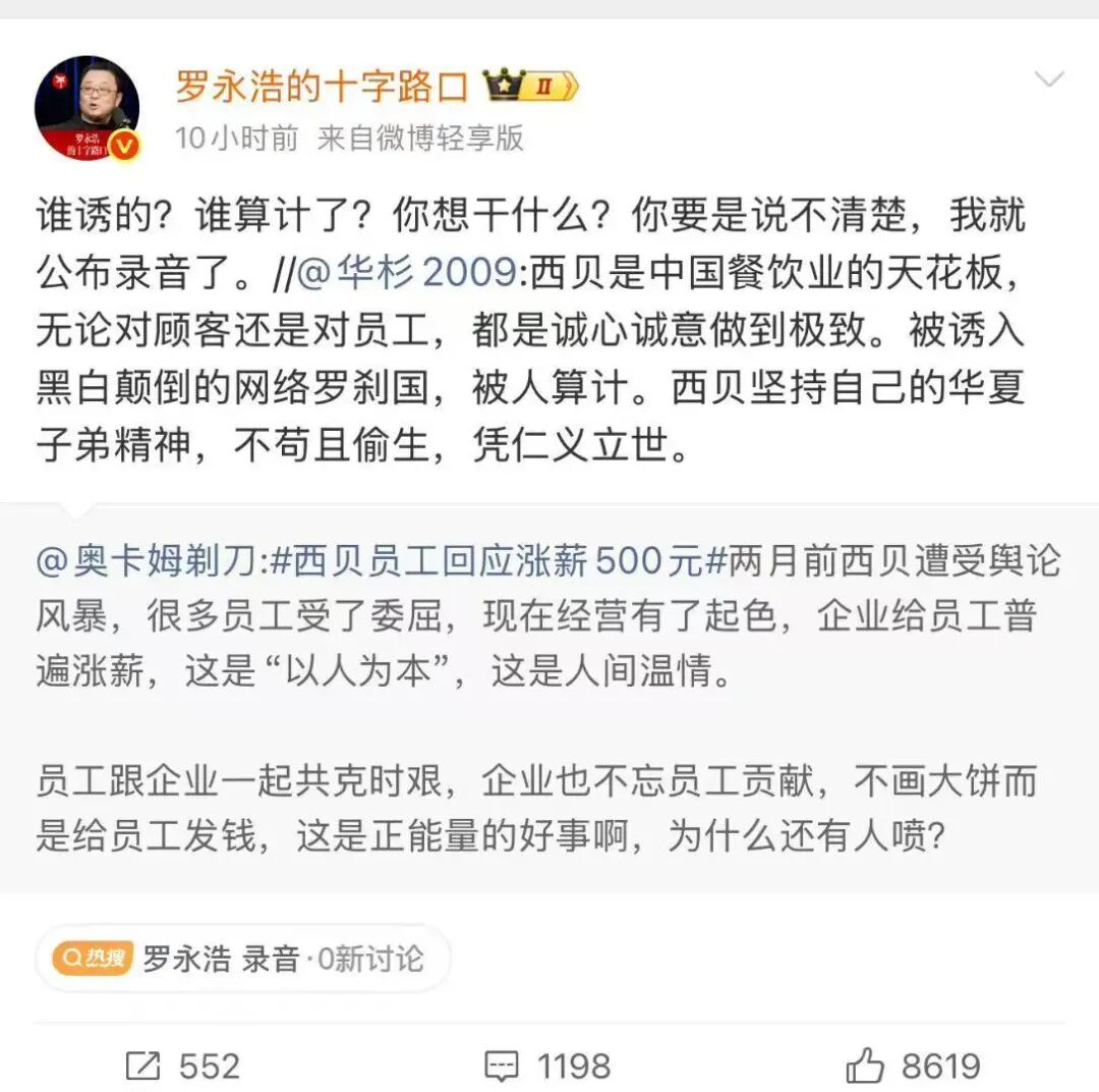 结果呢,到了微博上,华总竟然改了“话术”,截图传到罗永浩那里,老罗眼里只看到了“被诱入”和“被人算计”。但也有另外两种阴谋论观点,挺有趣。一种是华总是高级黑,表面夸,其实是要钱。你不给我咨询费,我就继续夸你……还有一种呢,则认为华总是以身入局,自己陷入了舆论战,但网友知道了西贝在改了,还给员工涨工资,转而心疼西贝。你更认同哪个呢?