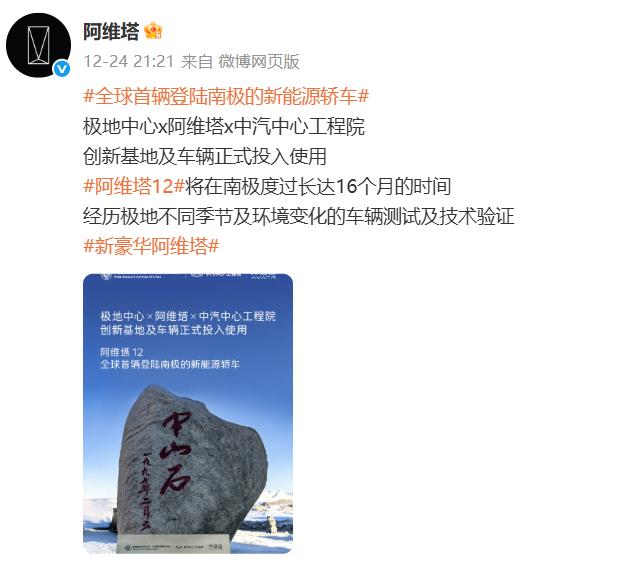 12月24日,阿维塔在社交媒体发文表示,“旗下车型阿维塔12将在南极度过16个月的时间,经历极地不同季节及环境变化的车辆测试及技术验证”,由此对早前相关话题引发的讨论作出澄清。