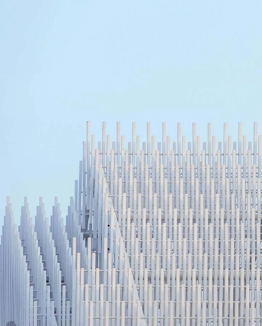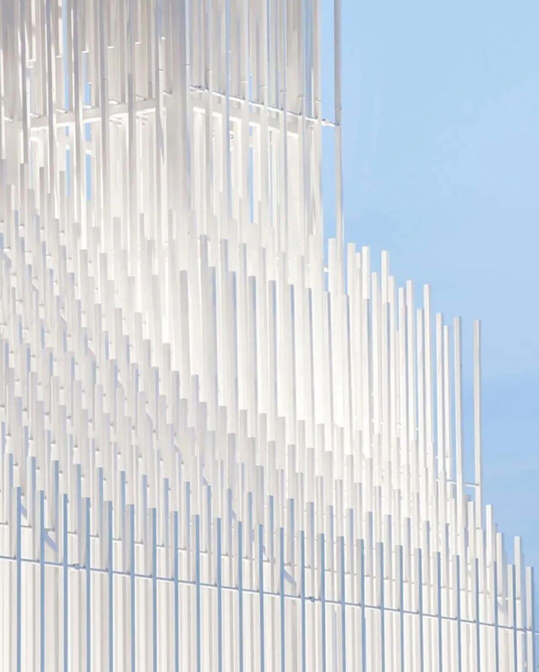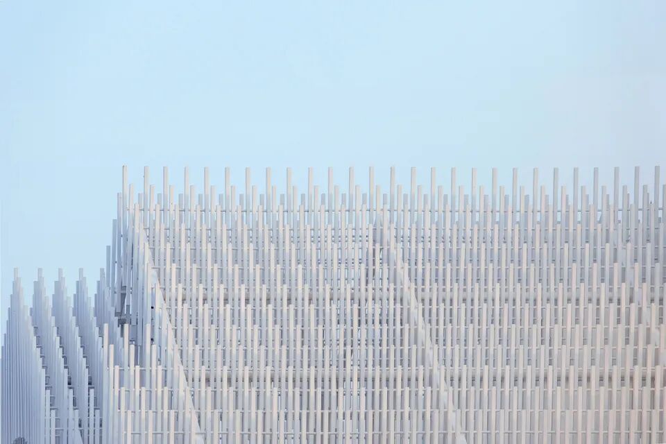 所以整座建筑放弃了所有实体墙面,全部用这种铝杆排列,为的就是让阳光穿过时能形成特别的光影效果。