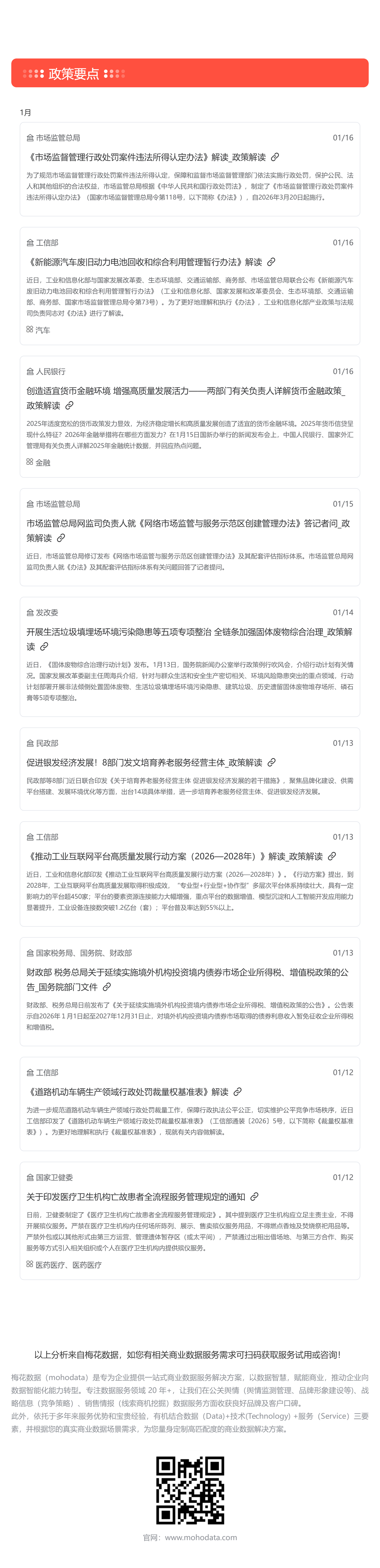 根据梅花数据舆情监测要政盘点统计,监测期间共收录重要政策信息共计98条,其中涉及金融、工业、汽车、外贸、养老等多个领域,建议重点关注《推动工业互联网平台高质量发展行动方案(2026—2028年)》、《医疗卫生机构亡故患者全流程服务管理规定》等政策。