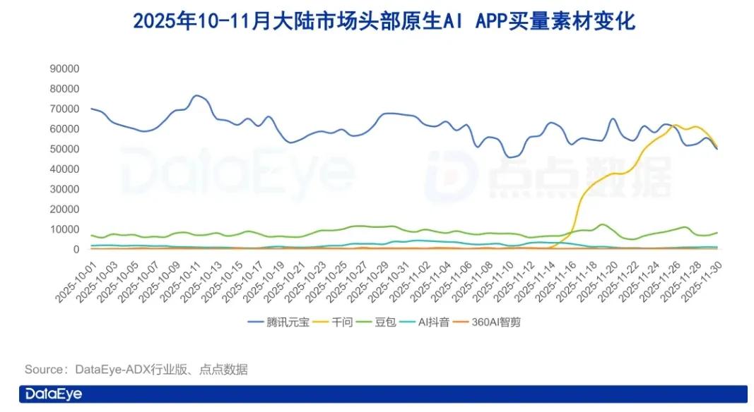 据《财经》报道,直至2025年10月,阿里的通义App(千问App前身)一度月活跃用户仅有300万,在大厂中几乎垫底。但2025年11月之后,千问App迭代明显加速,C端月活跃用户超过1亿。DataEye数据显示,千问11月投放量暴涨13726.1%,一度反超元宝。