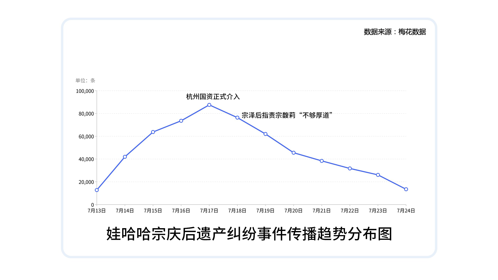 基于梅花数据公关智能体分析,“娃哈哈宗庆后遗产纠纷”事件的舆论影响体现为多层面冲击:首先,家族内部诉讼与公开指责(如宗泽后批评)将企业内部矛盾完全公开化,严重损害了品牌赖以生存的“家文化”形象与公众情感信任。其次,销量数据的短期下滑直接反映了舆论争议对消费者“情怀”的消耗与市场信心的动摇。最后,杭州国资的介入调查将舆论焦点从家族伦理延伸至公司治理与国有资产权益的合规性质疑,使事件性质复杂化,对品牌声誉与管理层威信造成长期负面影响。