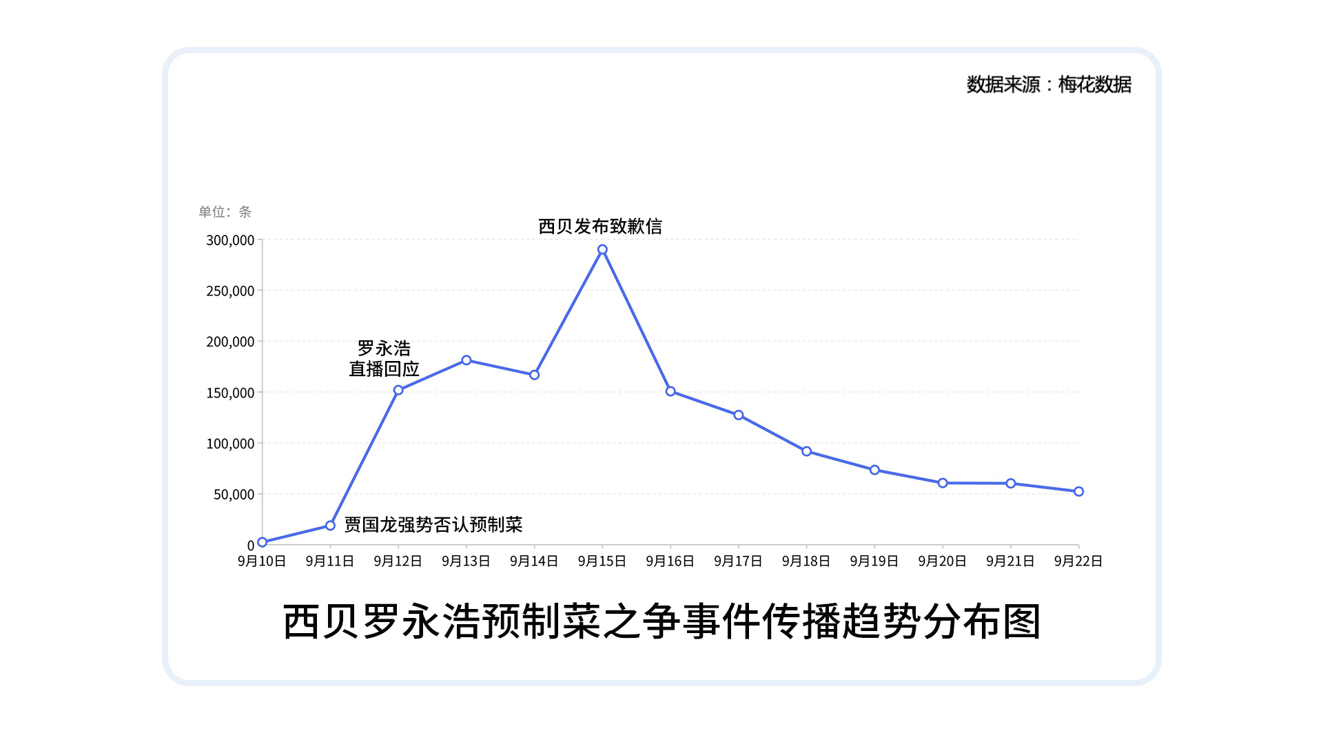 2025年9月10日,罗永浩公开指称西贝菜品“几乎全都是预制菜且价格昂贵”,引发舆论关注。西贝创始人贾国龙次日坚决否认,并宣布开放全国后厨。9月12日,事件出现关键转折,基于梅花数据公关智能体分析,多家媒体实地探访报道提及部分菜品存在“隔夜”情况及使用转基因油等细节,使争议焦点转向食品安全与经营诚信。9月14日,贾国龙在行业群内称罗永浩为“网络黑社会”的言论使危机升级。次日,西贝发布致歉信,承认工艺与顾客期望存在差距并承诺整改,事件逐渐平息。此争议从预制菜定义之争,最终演变为复合型品牌声誉危机。