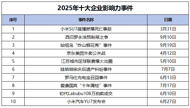1月4日,苏秦声誉管理实验室组织50位专家,对23个由大数据筛选的候选事件进行投票,依据评选规则和标准,“小米SU7碰撞燃爆死亡事故”等10个事件入围#2025年中国十大企业影响力事件(见下图)。