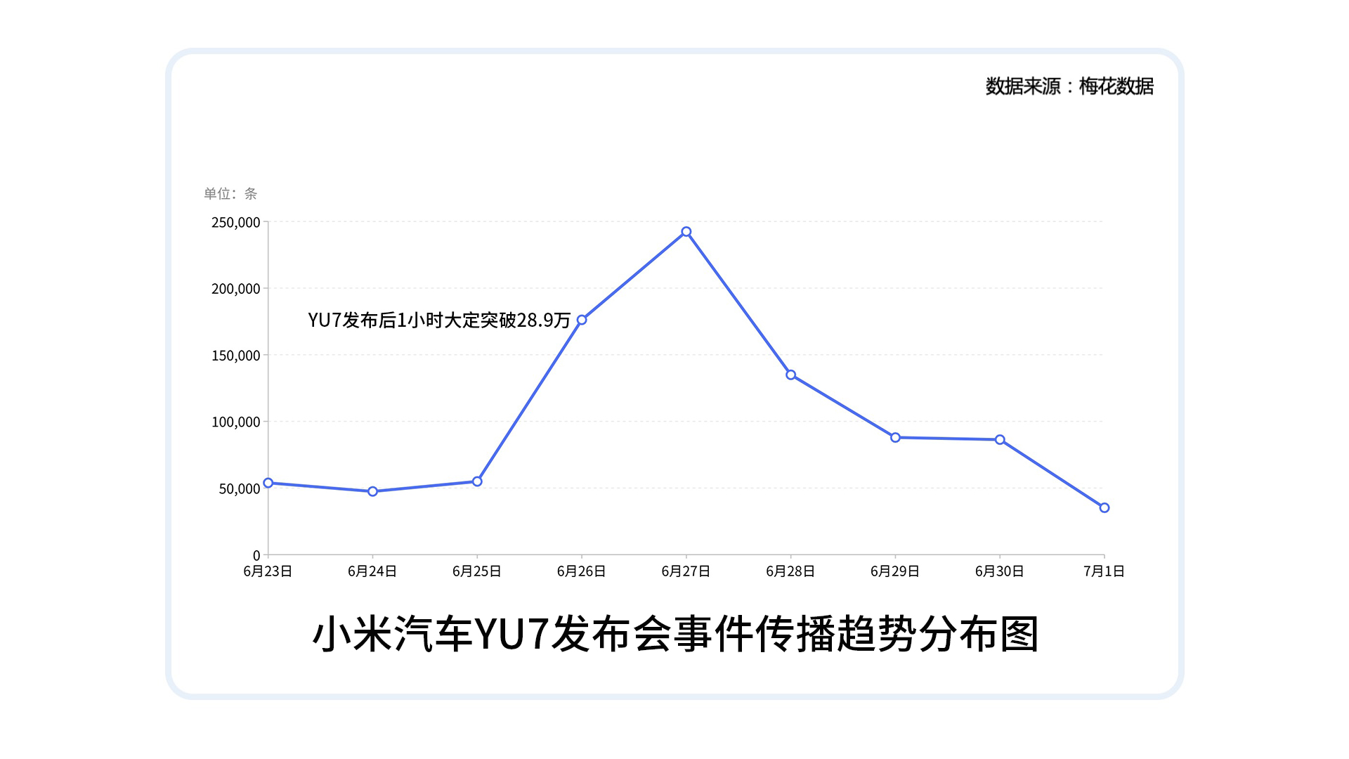 基于梅花数据监测,小米YU7发布会事件舆论呈现出显著的“两极分化”特征。积极影响方面,发布会创造的销售纪录(3分钟大定破20万)与续航世界纪录,强力巩固了小米“现象级爆款”与科技创新的市场认知,展示了强大的品牌号召力。争议与风险方面,赛道测试中刹车片起火事件迅速引发对车辆安全性与营销话术的广泛质疑;同时,友商高管的批评言论则将舆论焦点引向行业竞争与粉丝文化讨论。面对复杂的舆情环境,雷军内部“谨言慎行”、“以重点车企标准要求自己”的表态,体现了品牌在高压下的危机共识。