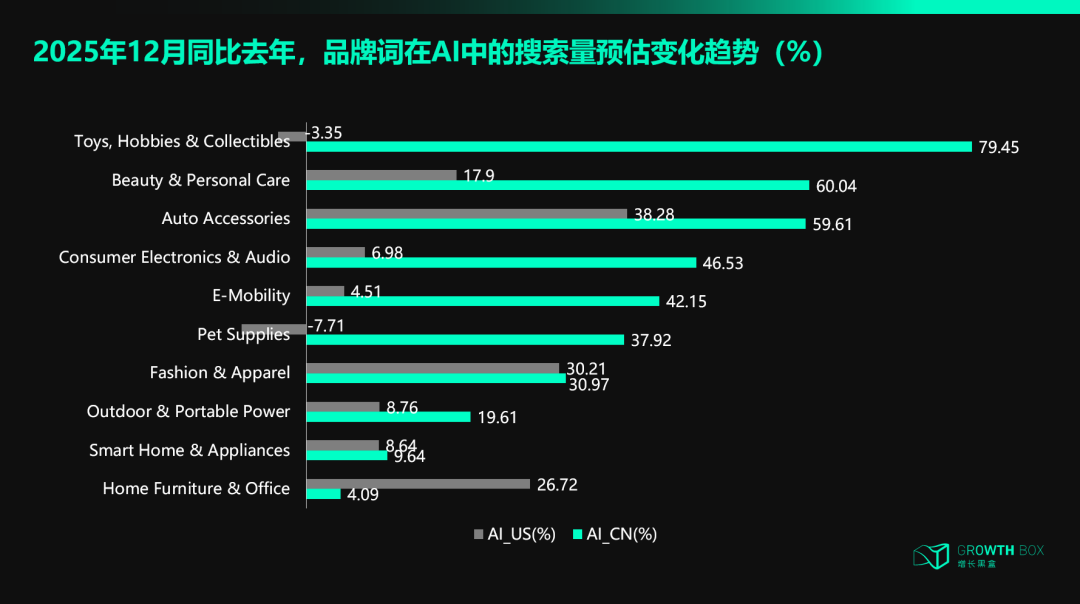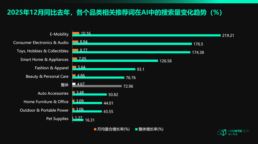 Toys, Hobbies & Collectibles、Smart Home & Appliances、Consumer Electronics & Audio、E-Mobility表现更加显著,因为它们产品迭代快、新品牌涌现多、消费者决策需要大量信息整合—恰好是 AI 擅长的场景。