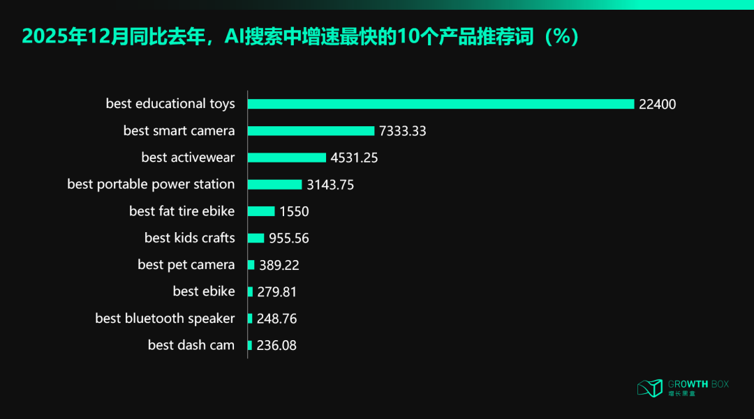 随后,基于专业数据库回溯了13个月时间段内(2024.12-2025.12)美国用户向 AI 工具提问时出现这些词的预估次数,并进行变化趋势统计。