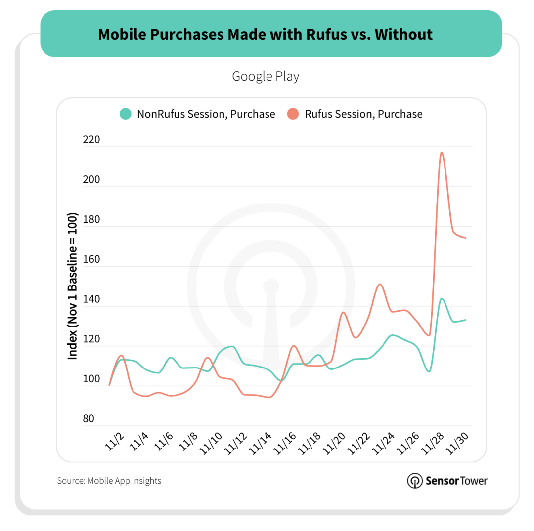Amazon Rufus是最典型的案例。据2025年Q3财报,Rufus月活同比增长140%,预计带来100亿美元年增量销售[4]。更关键的是:使用Rufus的消费者,完成购买的可能性比不使用者高60%。[5]。黑五期间,有更大比例的用户借助Rufus直接下单。