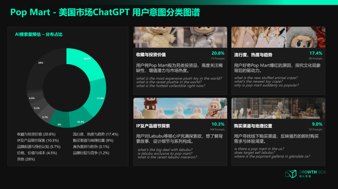 先看"发现"这条路径。占比最高的用户意图是"收藏与投资价值",用户搜索的是"世界上最贵的毛绒玩具是什么"、"现在最火的收藏品是什么"—这些开放式提问背后,用户并没有明确的品牌指向,他们是在让AI帮自己做筛选。当AI的答案中出现Pop Mart时,品牌就完成了一次"被发现"。