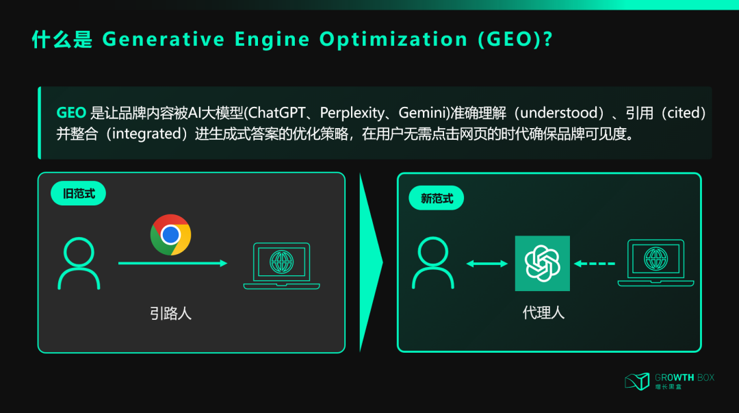 过去10年,出海品牌的必修课是 SEO(搜索引擎优化),那么未来五年,核心技能将彻底转向 GEO(生成式引擎优化)。根据普林斯顿大学、佐治亚理工等机构在2024年联合发表的论文《GEO: Generative Engine Optimization》,GEO被正式定义为一种通过优化内容结构,提升品牌在大型语言模型(LLM)回答中可见度的策略。