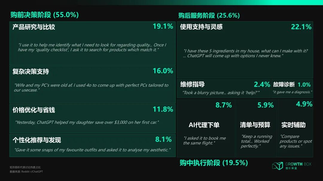 我们也深入调研了Reddit数百位真实用户的发言,构建了一个AI购物应用场景的图谱。其中: