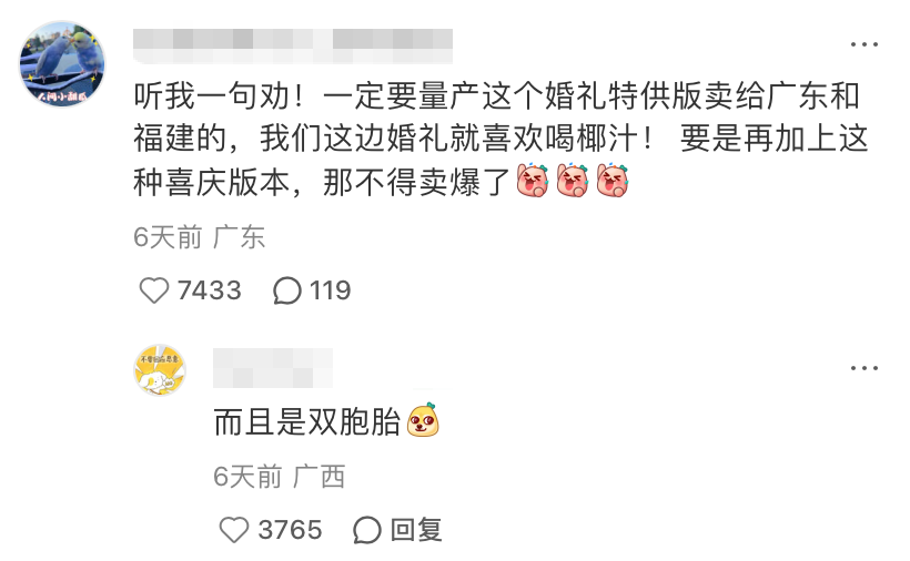 有人建议婚礼特供版卖给广东和福建的,这两个地方的婚礼就喜欢喝椰汁。