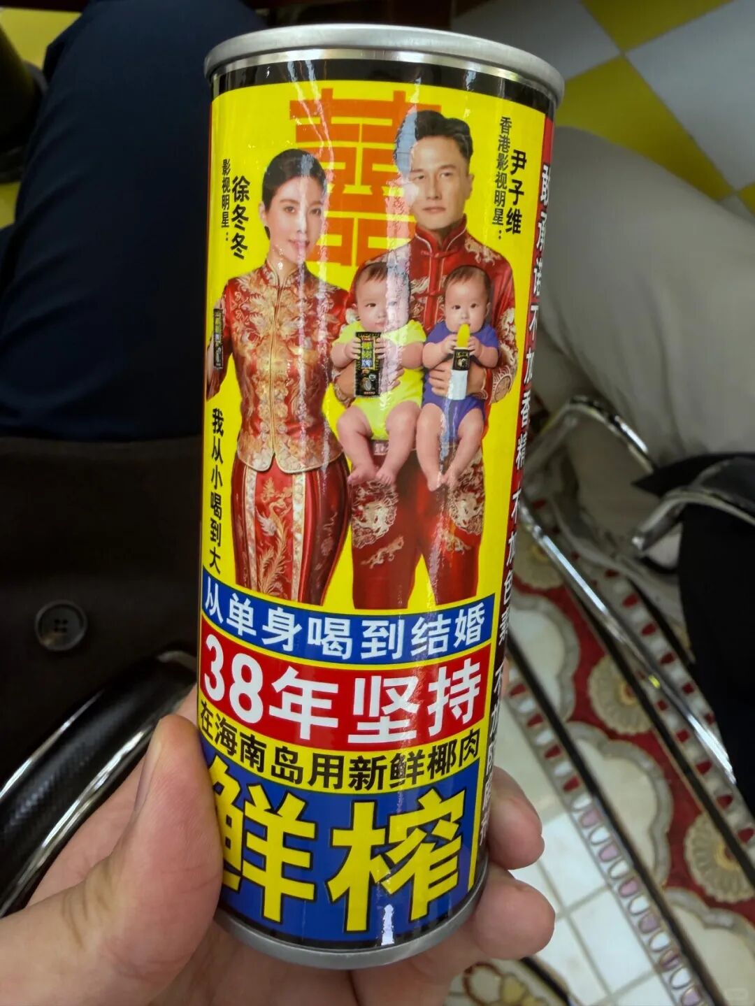 椰树牌顺势推出结婚版椰汁,瓶子外身从原来经典的徐冬冬单人照,变成两人穿着秀禾服和长衫马褂,抱着两个娃娃的“结婚照”,整体氛围非常喜庆。瓶身文案除了“从小喝到大”之外,还加了句“从单身喝到结婚”。