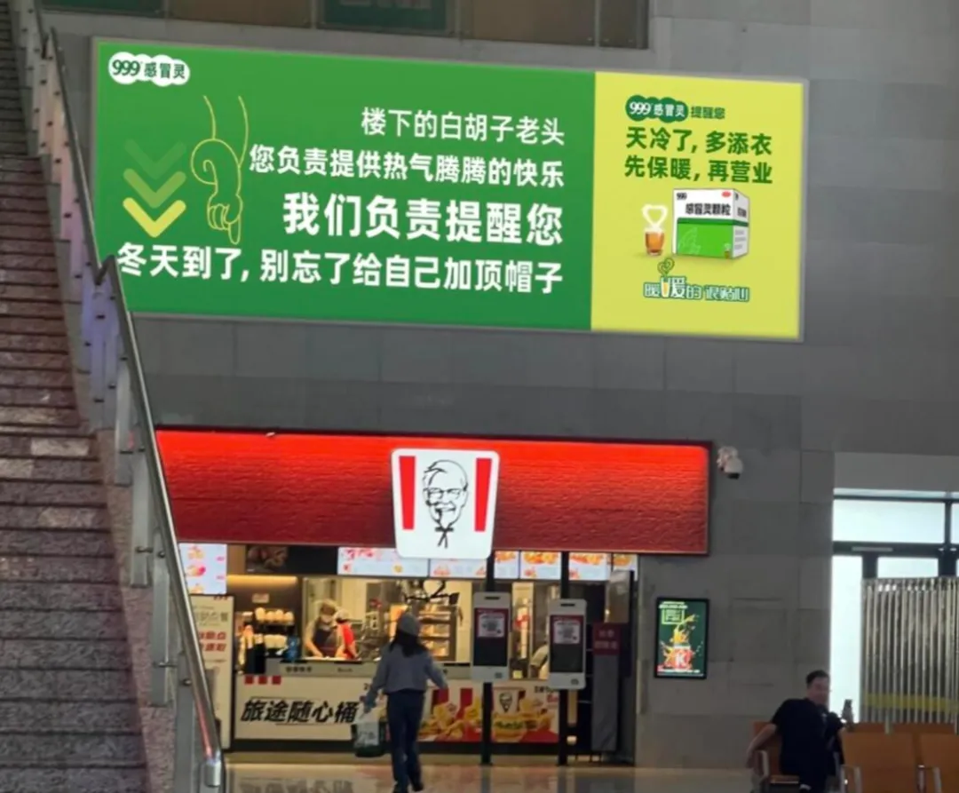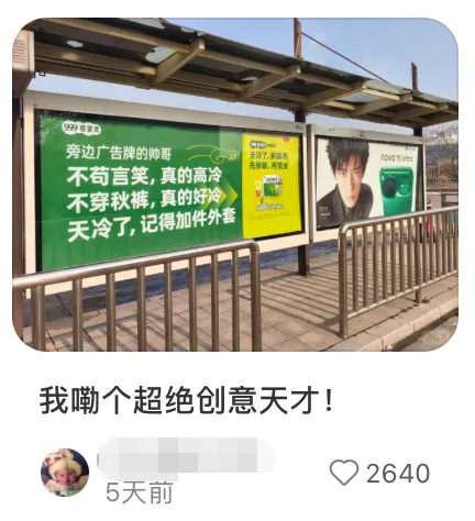 999感冒灵没请代言人,全靠蹭别的品牌的代言人火出圈了。本周,不少网友在线下看到自家偶像海报旁边,多了张999感冒灵“劝人穿多点”的文案海报。