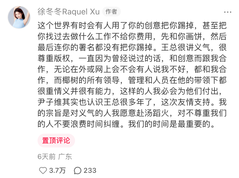 徐冬冬本人在小红书上解释为何自己的婚礼专属饮料是椰树牌椰汁,因为“王总很讲义气,很尊重版权,一直因为曾经说过的话,和创意而跟我合