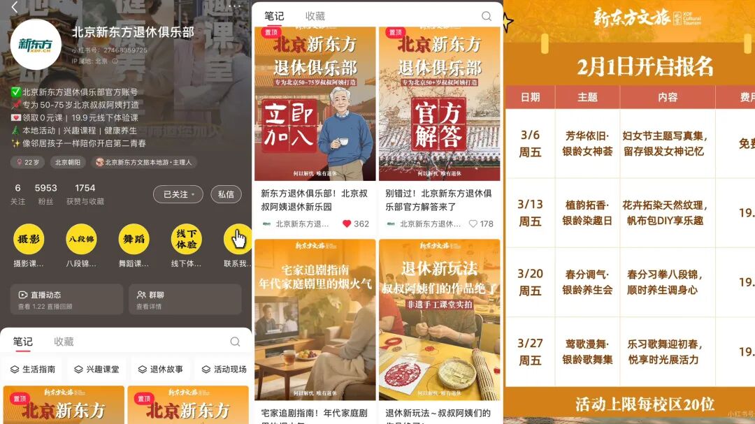 于是他们开发了新的获客方式——教育消费。愿意花时间上课、参加活动、追求精神体验的老人,本身就是潜在的高质量文旅与康养用户——这也是为什么北京新东方退休俱乐部课程里会捆绑一日游赠品。