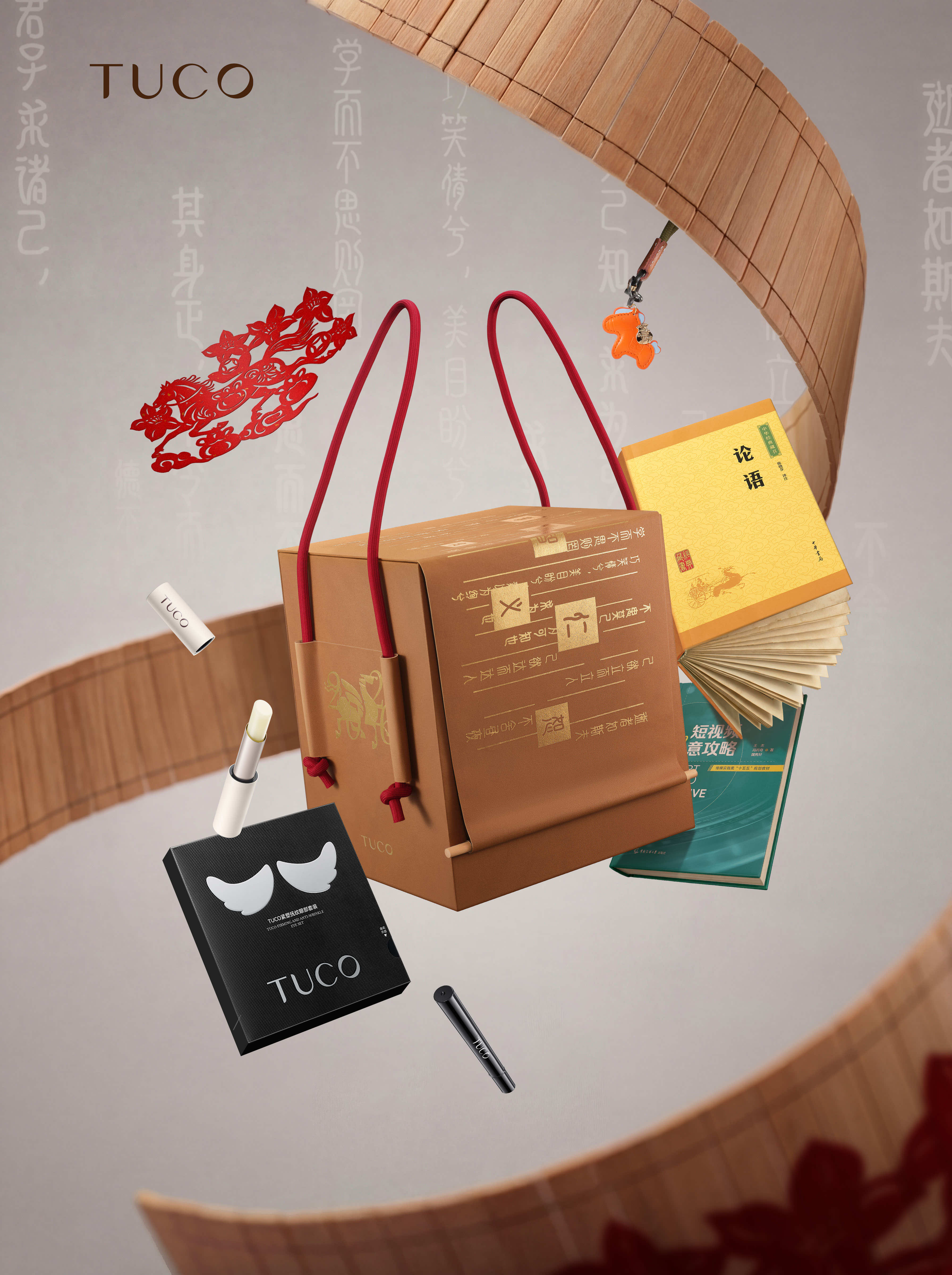礼品包含剪纸作品来自广州非遗剪纸传承人何丹凤,《论语》和《短视频创意攻略》让你古今并读,还有“马上有钱”包挂,和TUCO新品天竺葵精油唇膏、羽翼眼膜。