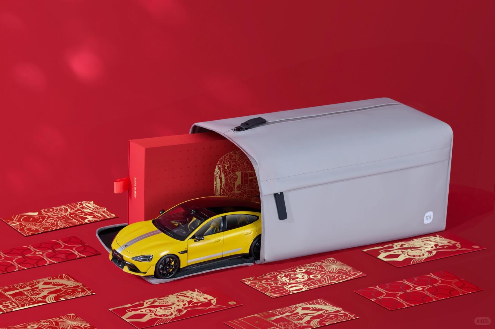 小米的新年礼盒是一只超大的“纳福吐新”吐司包,里面有1:18精密比例复刻合金车模盲盒,特邀小米书法大师(庄子昂、程思思、王晨生、曾建老师)亲笔挥毫对联,人车家主题定制红包等。