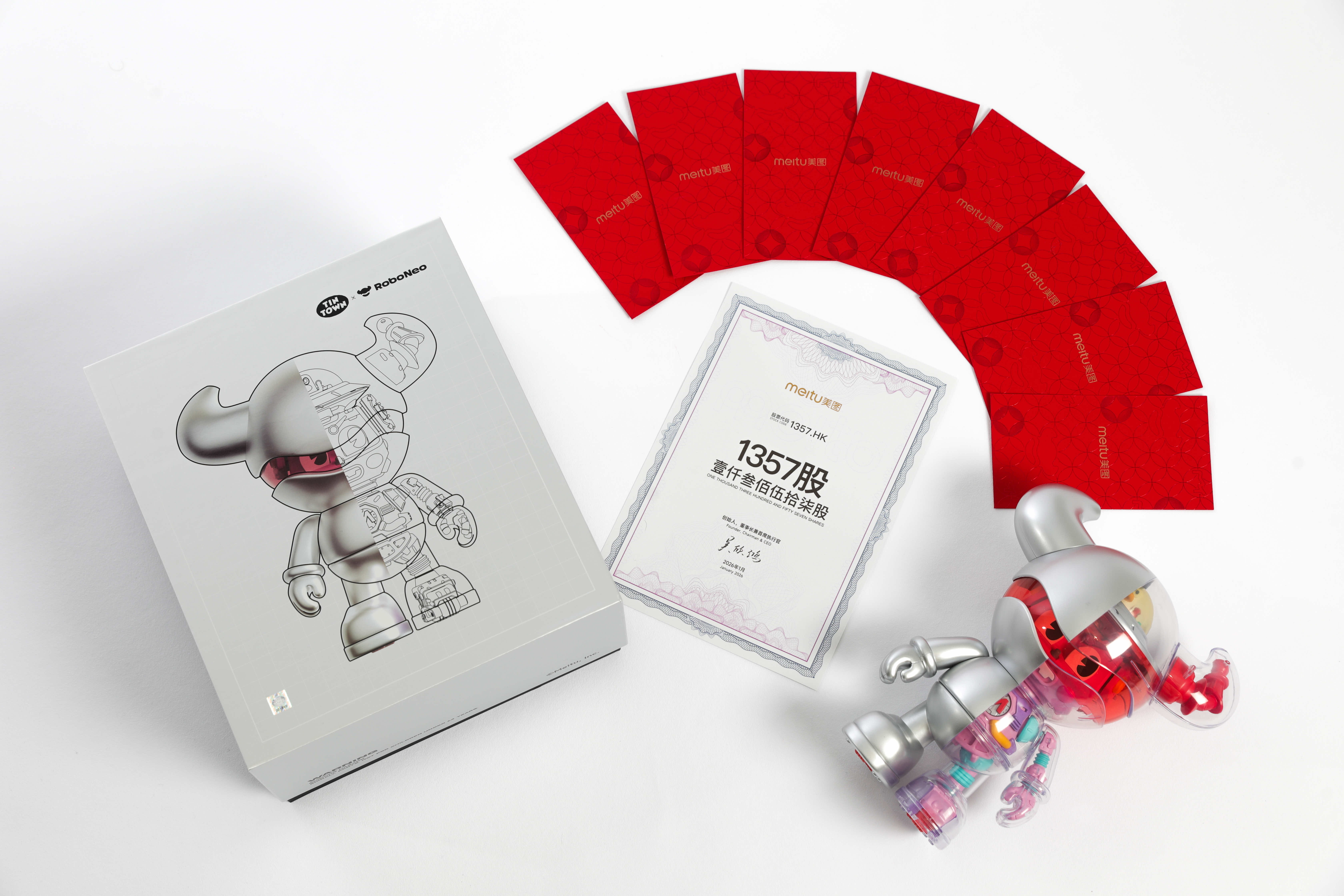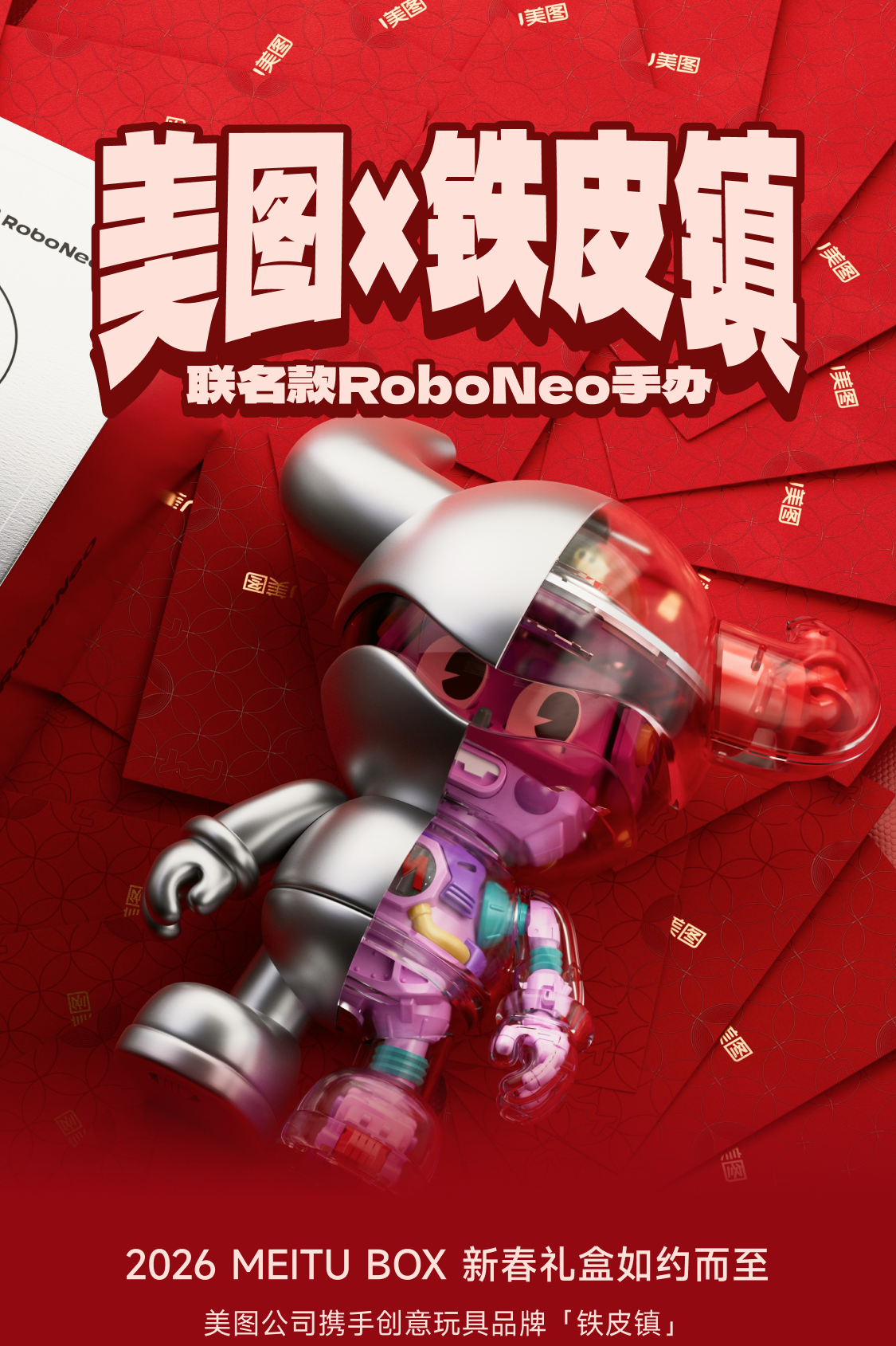 美图的新春礼盒里有一款以旗下产品「RoboNeo」IP形象为原型的手办,与创意玩具品牌“铁皮镇”联名推出,AI与实体的创意融合,赛博朋克的复古机械美学感拉满。