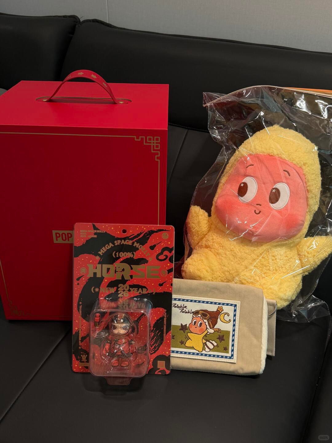 泡泡玛特的员工版新年礼盒里有红黑配色的Molly马年吊卡、星星人奇妙漫游系列卡包,还有坐姿形象的星星人公仔。