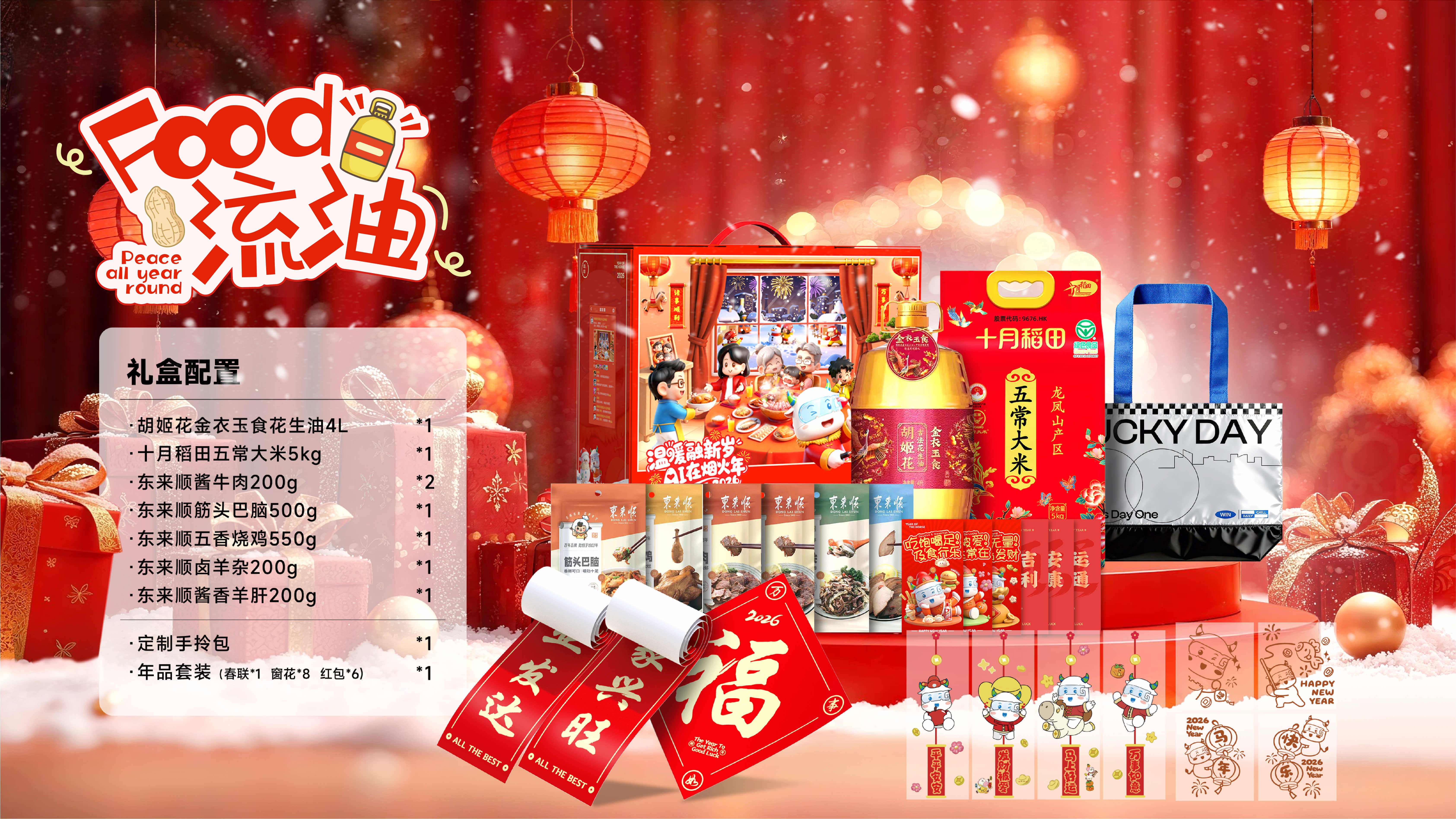礼盒里还有折页故事册、多款年味糕点,以及设计精美的红包、对联和福字。