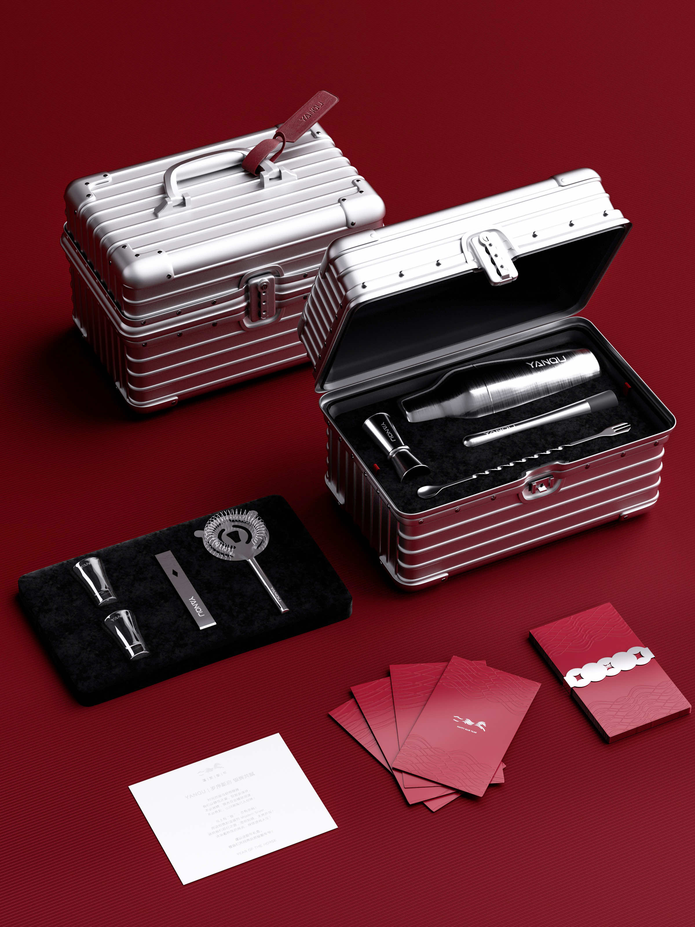 礼盒选取冷冽而温润的银为礼盒主调,内含寓意轻装迈向新途的mini银色行李箱、为您摇匀往昔的银摇酒壶套装,沉淀值得品味的此刻、以及为礼盒注入一抹热烈的红包。