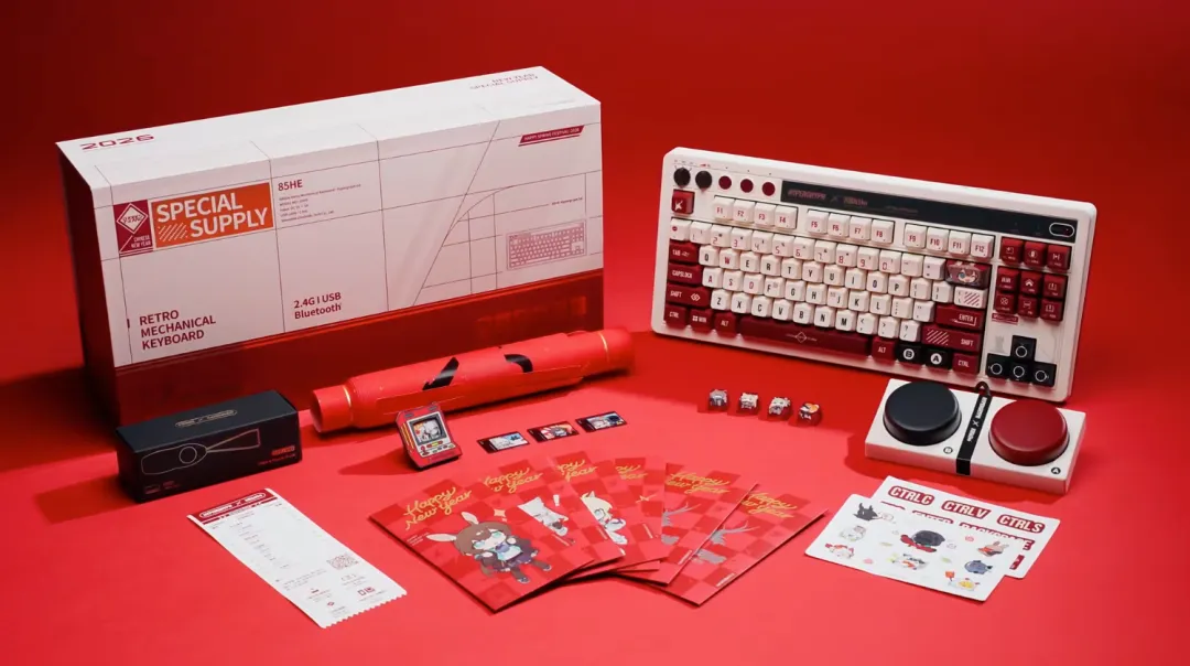 鹰角网络联名八位堂带来新春礼盒,有超好看的Retro 87复古键盘,“拍拍键”编程超级按键,4款角色IP键帽,角色IP红包、春联和福字等。