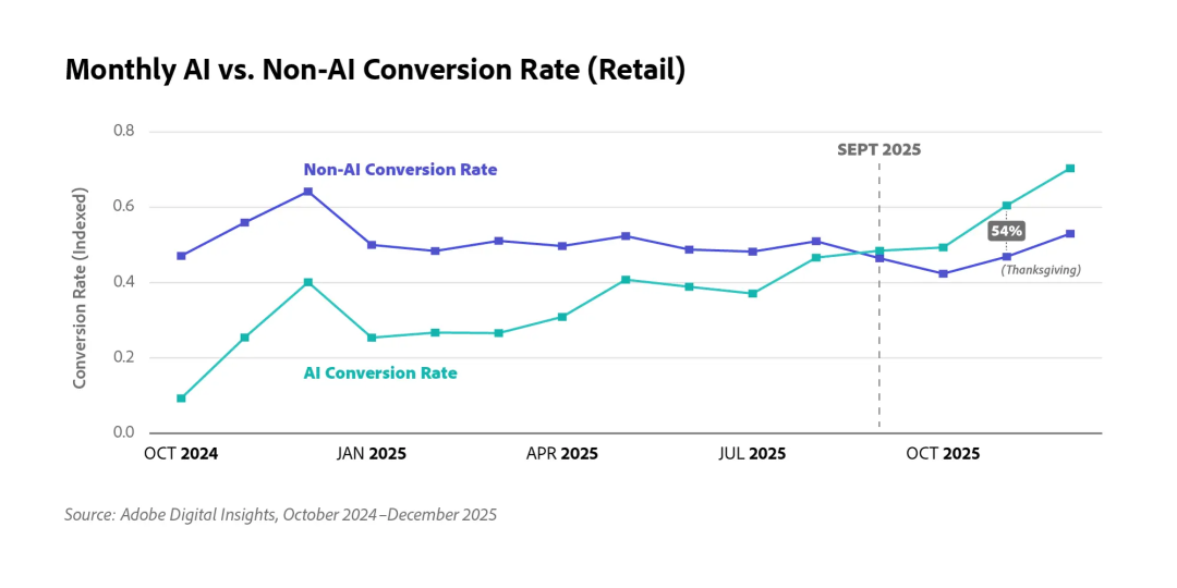 Adobe analytic 最新的全球数据已经验证了部分事实:由 AI 导流至电商网站的下单转化率,已经在购物季反超了非 AI 引流渠道。