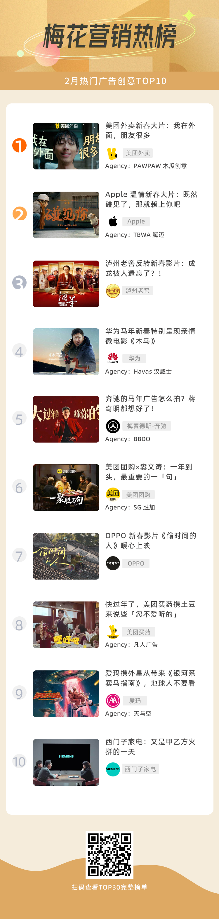 梅花营销热榜 是梅花网基于平台收录作品的点击数、喜欢数、收藏数等数据综合得出的创意榜单,2 月榜单新鲜出炉!