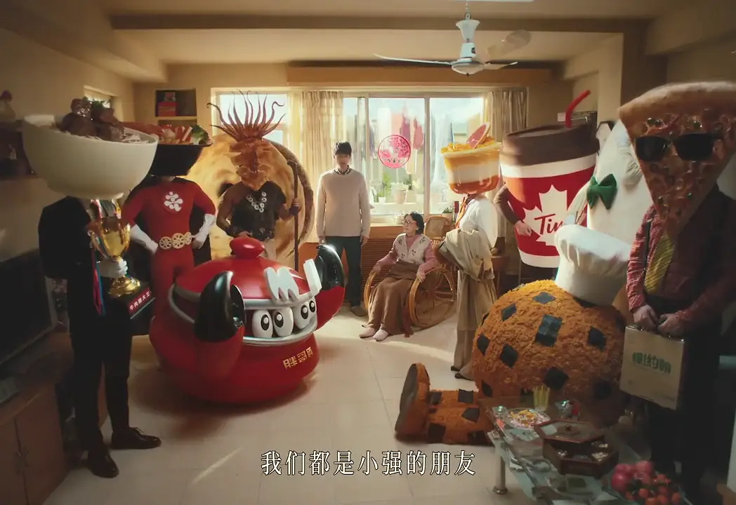 故事开篇,面对奶奶「一个人在外面,很辛苦吧?」的担忧,主角张小强脱口而出「我朋友挺多!」。他灵机一动将常点的外卖加入好友战队,用报菜名的方式讲起了自己的交友日常。在不断圆谎的过程中,我们也看到了小强生活的另一面,那些被退租、被分手、被优化的艰难时刻,都在一单单外卖的陪伴下挺了过来。原来,这些餐饮品牌早就成为了他的隐形朋友,也成为了他努力生活的印记。