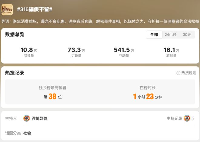 大叔还发现,在微博上,有一个话题叫做#315骗假不留#,目前已经10亿的阅读量,主持人是@微博媒体 ,包括央视财经在内,几乎所有地方融媒体的315报道,全被集中到了这个话题之下。