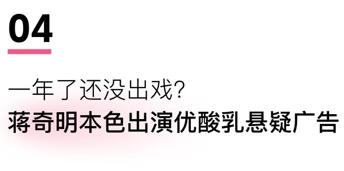 去年4月,蒋奇明曾为优酸乳嚼柠檬拍摄广告片。蒋奇明在脖子上套柠檬片样子的伊丽莎白圈,演出“一颗柠檬的自白”。为了被嚼,蒋奇明这只“柠檬”做了许多努力。一年过去了,蒋奇明再次出演优酸乳广告片,还带来两种新口味红心苹果版和血橙版。