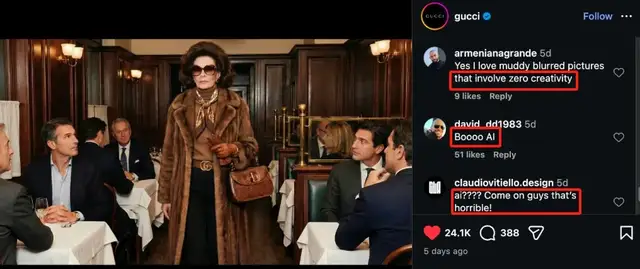 Gucci此次米兰时装周的争议是典型例子。米兰时装周作为时尚界“三大殿堂”之一,更是Gucci大本营,在这样的重要场合采用AI物料,和用户预期有明显落差,甚至会被视为一种“敷衍”,以及对时尚界规则的“挑衅”。