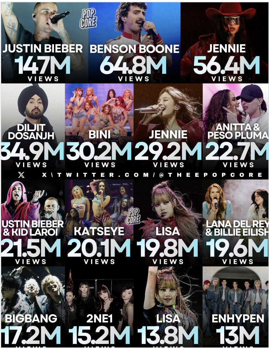 在线上社媒传播层面,同样夸张。仅第一个周末便创下了约8.7亿美元的媒体曝光价值,几乎追平前年两个周末创下的9.08亿美元的总和,并有望超越去年。根据官方IG账号播放量显示,今年包括Justin Bieber(147万)、BINI(30.2万)、Justin Bieber&Kid Loroi(21.5万)、KATSEYE(20.1万)、BigBang(17.2万)等多位参演艺人的播放量进入历史前列。