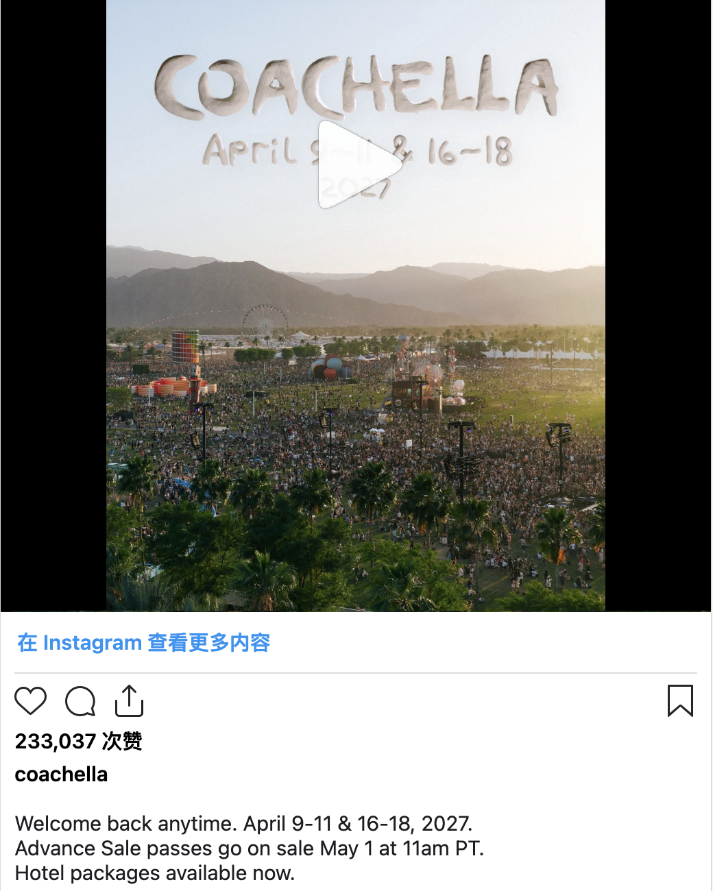 事实上,正是在去年官宣此阵容仅仅不到一周的时间内,2026年科切拉音乐节门票也罕见地火速售罄,二级市场也一票难求。