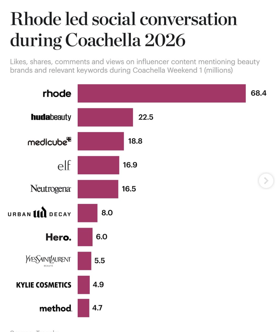 此外,在品牌曝光也同样集中爆发。根据BOF统计,仅在科切拉举办的第一周,由Hailey Bieber创办的美妆品牌rhode以超过6840万的互动量,位居社媒讨论榜首;包括Huda Beauty、Medicube、e.l.f等流行时尚品牌均在科切拉周期内传播声量大幅提升。