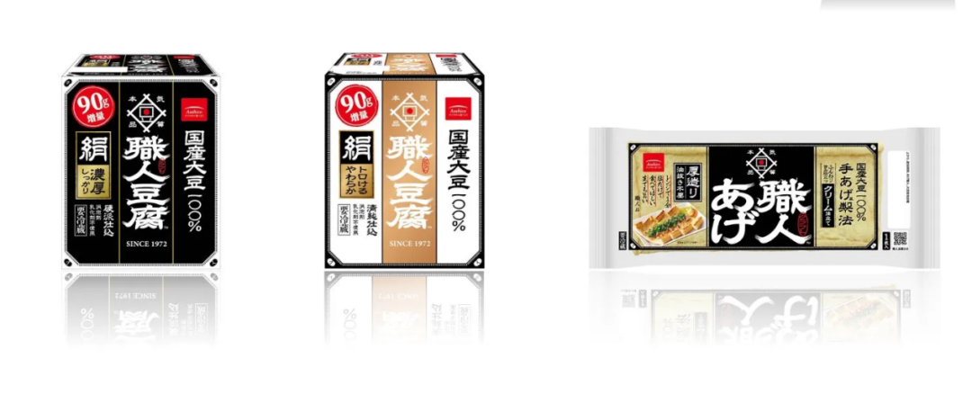 另一款叫职人豆腐 (職人豆腐),写法是职人,英文却是Craft,致敬精酿啤酒。用青森大铃品种大豆,100%国产,温凝固工艺,包装上打刻大豆产地、品种和做这块豆腐的师傅名字。条件是从业10年以上并通过Asahico职人认定考试。目的是打破日本豆腐88日元的低价天花板。