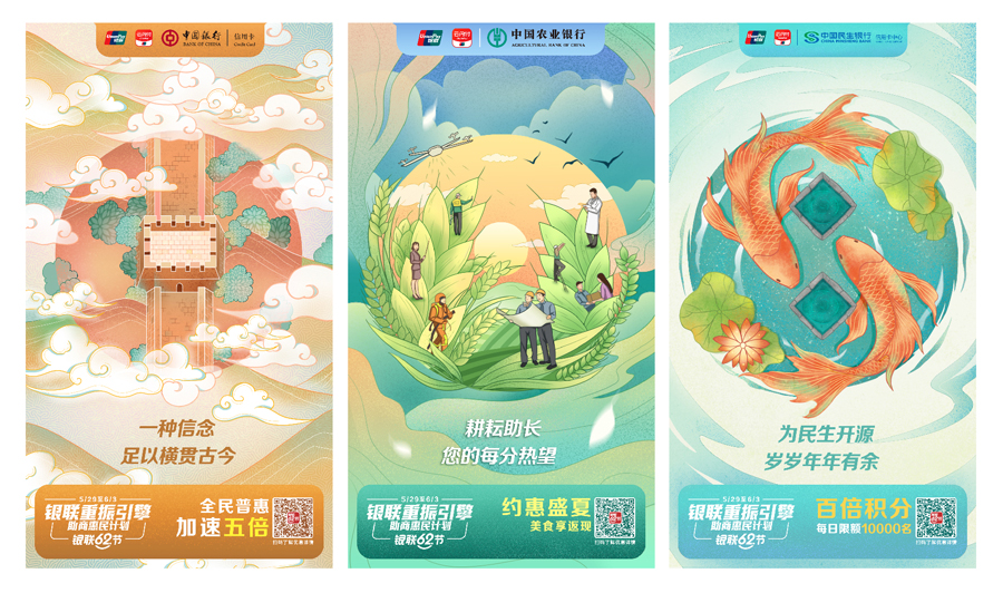 银联迎来第一个疫情后的线下购物节:62节,联合银行及商户,推出积分、折扣等回馈活动,要让人们花的每一分钱都值得,助力人们过好生活。配合本活动,特别推出了一组创意动图海报。